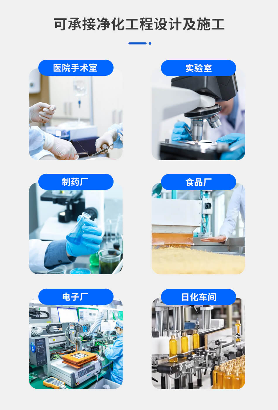 我公司可承接各類醫藥工廠、手術室、GMP車間、電子無塵車間、實驗室、化妝品生產車間以及所有類型的凈化工程(包括凈化整體工程、通風凈化機組等),提供一站式設計、安裝、調試、維修、檢測、保養等服務。